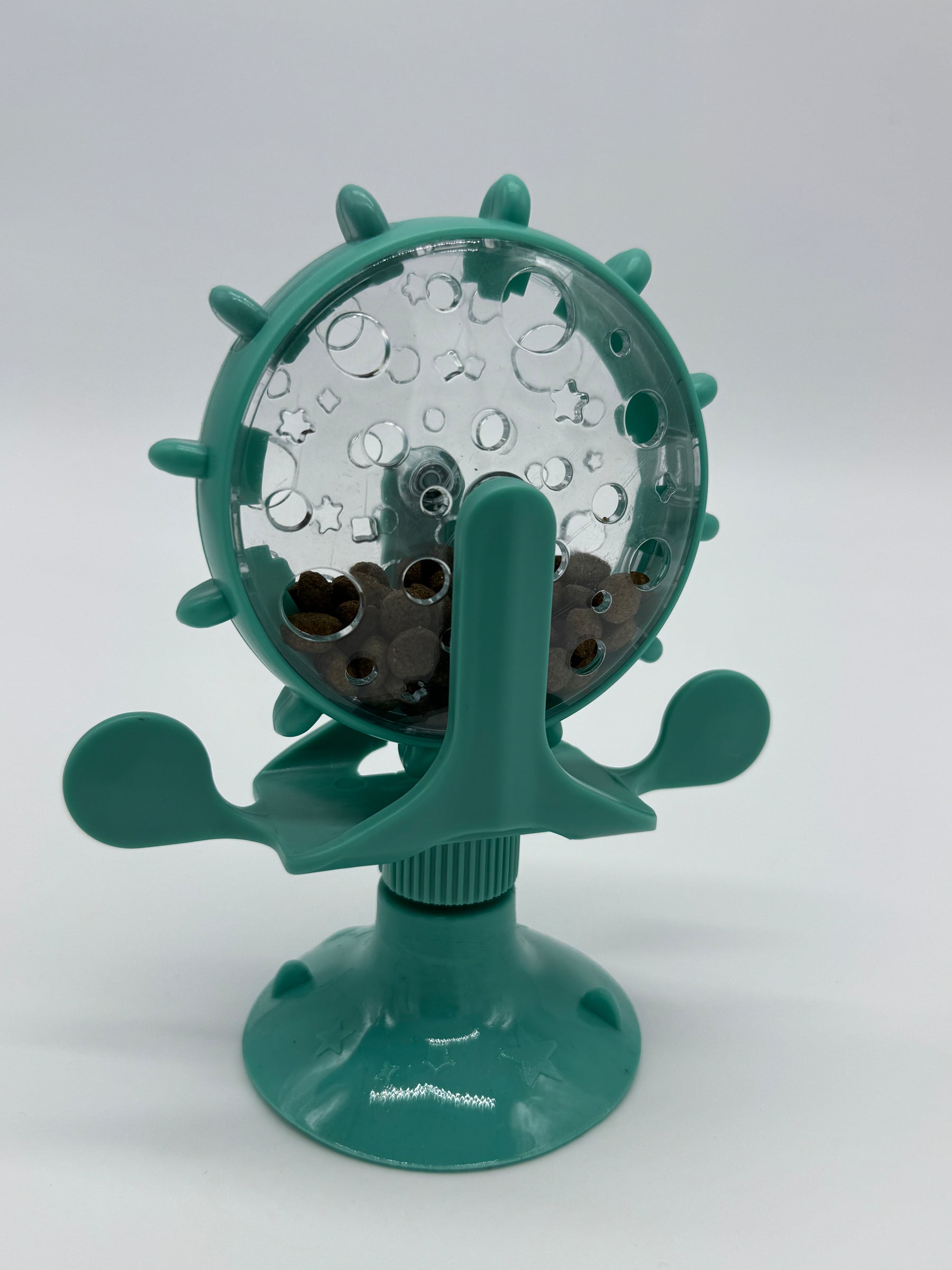 Lorsque votre chat fait tourner la roue , les friandises tombent automatiquement dans le récipient inférieur grâce aux ouvertures de tailles différentes , ce qui permet d'ajuster la difficulté, la quantité distribuée et de rendre chaque session de jeu unique.