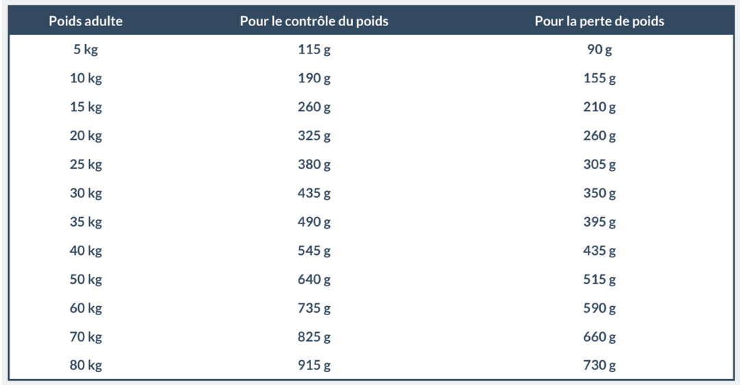 Ration quotidienne conseillée Les quantités proposées dans le tableau ci-dessous sont des rations moyennes journalières recommandées. Elles servent de base à l'élaboration de la ration quotidienne, mais doivent être adaptées aux besoins réels du chien. Elles peuvent donc varier en fonction des dispositions individuelles et naturelles de votre animal, ainsi que de ses spécificités génétiques et morphologiques.