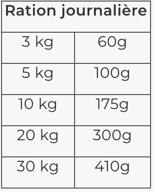 Ration quotidienne conseillée Les quantités proposées dans le tableau ci-dessous sont des rations moyennes journalières recommandées. Elles servent de base à l'élaboration de la ration quotidienne, mais doivent être adaptées aux besoins réels du chien. Elles peuvent donc varier en fonction des dispositions individuelles et naturelles de votre animal, ainsi que de ses spécificités génétiques et morphologiques.